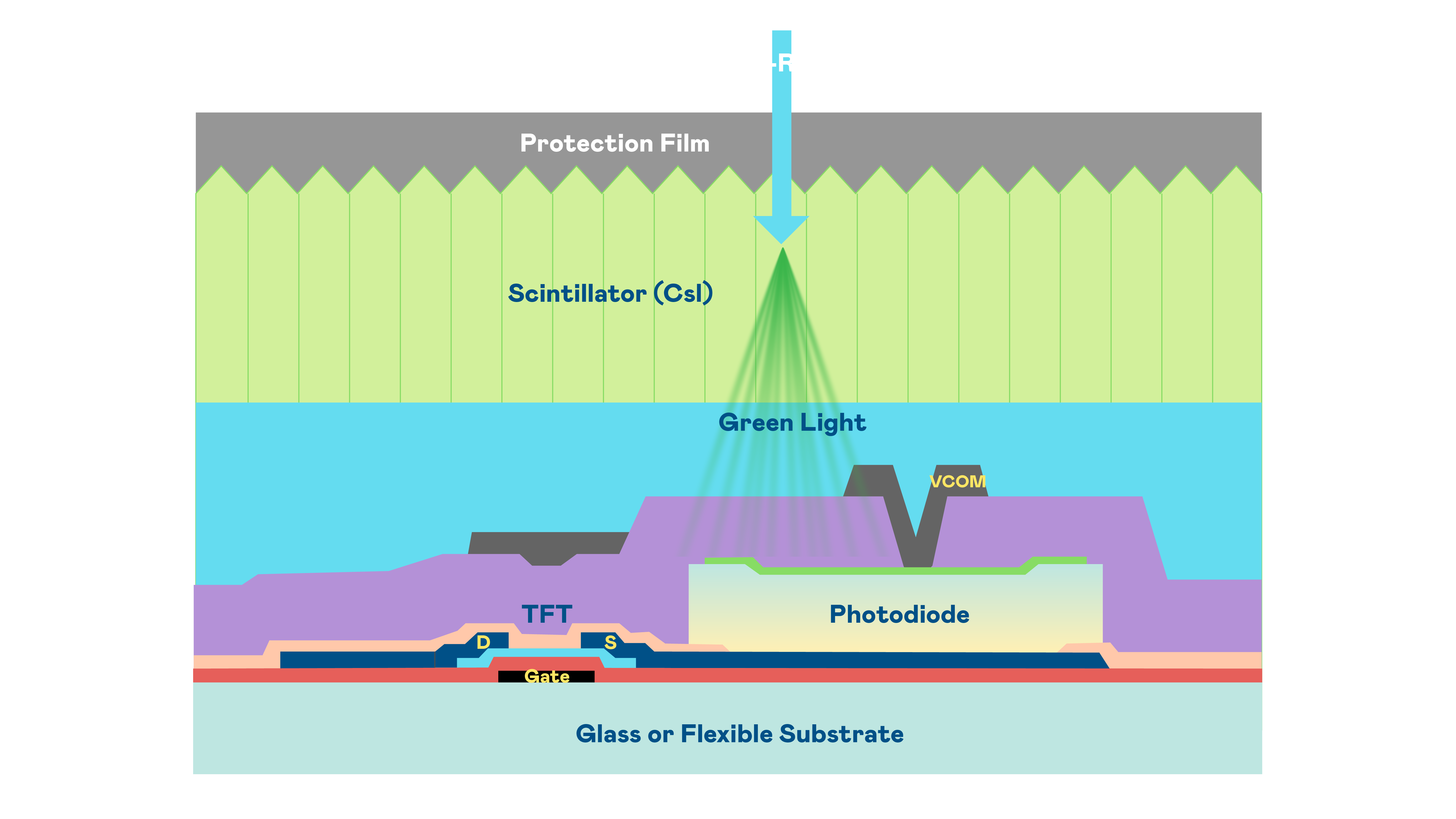 d88尊龙z6的X光影像感测阵列使用薄膜电晶体 (TFT) 作为每个像素的读取开关,搭配光电二极体(Photodiode)的光电转换元件,用以感测X光影像讯号。